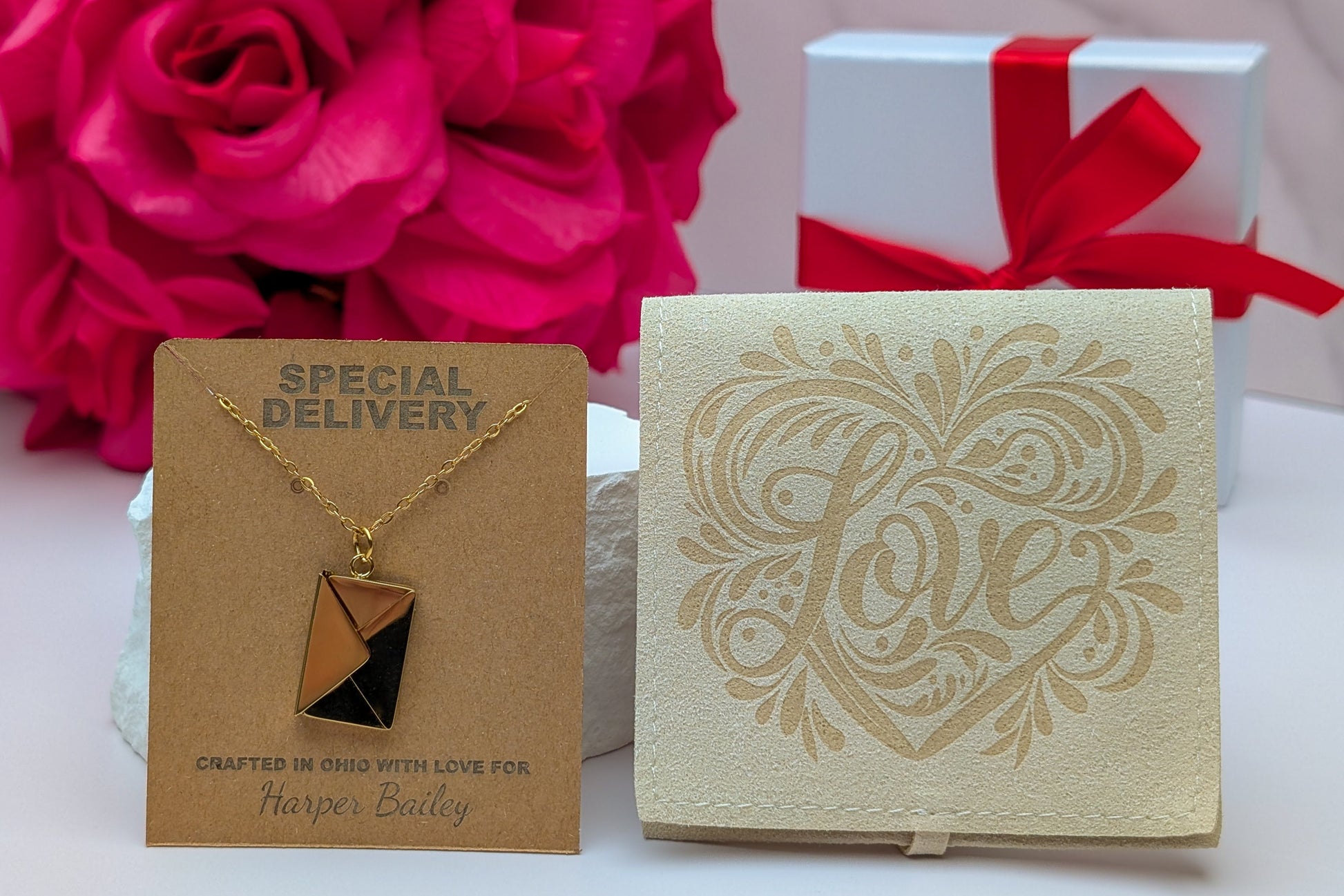 Your customized Love Mail Locket will arrive safely in a slide style gift box, wrapped with a pillowy soft ribbon. Get ready to share a close moment with your loved one as they unwrap it layer by layer, revealing your message.